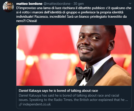 D'improvviso una lama di luce rischiara il dibattito pubbico: c'è un giornalista italiano che fraintende le parole di un attore (che dice tutt'altro, btw) per cercare di farlo passare per uno che s'è rotto le palle della questione razziale. Sarà il solito Feltri? No, è Bordone!pic.twitter.com/srirlBZ2Fx