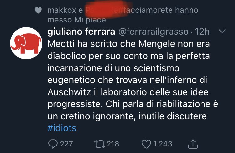 "Auschwitz laboratorio di idee progressiste" Chiunque abbia messo rt o like a questo abominio storico può definirsi tranquillamente un revisionista. Evidentemente sono tanti e nemmeno cosi ignoranti. Sono quelli che arano il terreno dei futuri Salvini.https://twitter.com/ferrarailgrasso/status/1223710978044571653 …