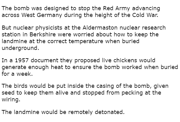 Nuclear physicists at the Aldermaston research station faced a problem with Blue Peacock, a nuclear weapon designed to deny a Soviet occupation of West Germany: winter temperatures. In 1957, they proposed a novel heating solution: live chickens. http://news.bbc.co.uk/2/hi/uk/3588465.stm …pic.twitter.com/jzmPD657uP