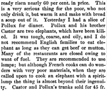 On many menus during the Siege of Paris: zoo animals from the Jardin des Plantes, including elephant, antelope, and kangaroo. Henry Labouchère described the flesh of Pollux, one of the two elephants butchered, as "tough, coarse and oily."pic.twitter.com/TmePCauaT2