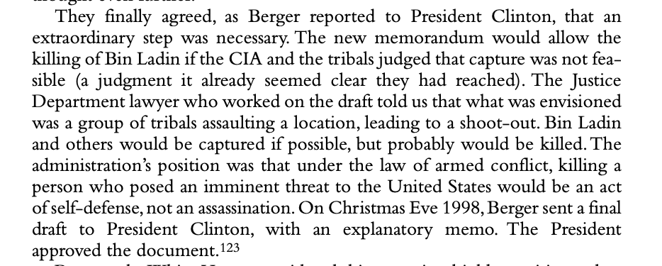 That legal move -- not assassination because self-defense -- actually first occurred at least as early as 1998, in connection with the planned covert action in Afghanistan against Bin Laden. From the 9/11 Commission Report: https://twitter.com/samuelmoyn/status/1213807602569764864 …pic.twitter.com/e46ETti83V