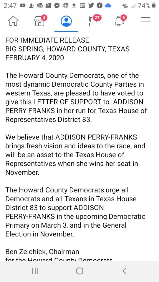 BIG SPRING, HOWARD COUNTY, TEXAS FEBRUARY 4, 2020 The Howard County Democrats, one of the most dynamic Democratic County Parties in western Texas, are pleased to have voted to give this LETTER OF SUPPORT to ADDISON PERRY-FRANKS https://drive.google.com/file/d/1UHmTn6--HEY00yJYCPoBLaVzVE3sehLM/view?usp=drivesdk …pic.twitter.com/vQuh2vvpug