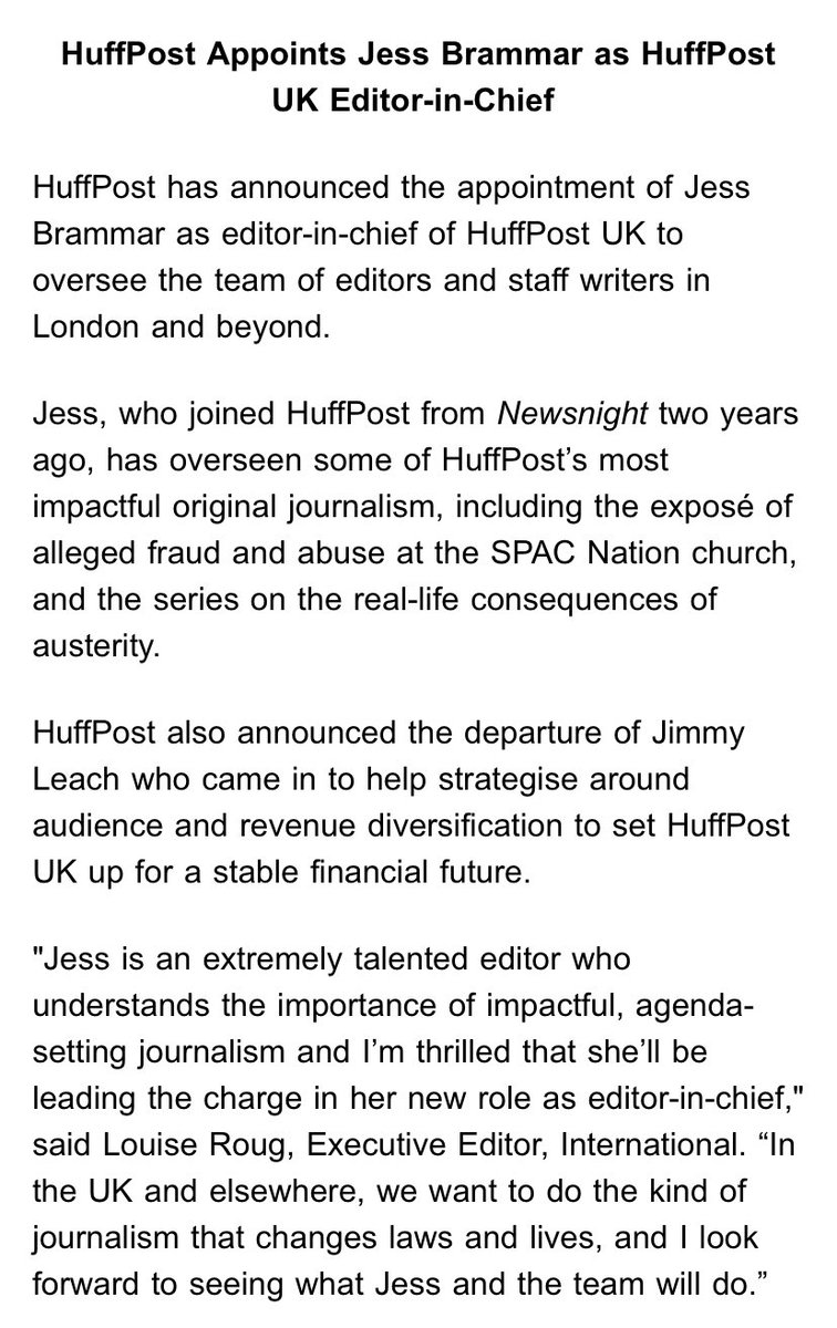 NEW: HuffPost UK promotes Jess Brammar to editor-in-chief and announces the departure of the Jimmy Leach — who was in the job for less than a year.pic.twitter.com/U4UozxCiVn