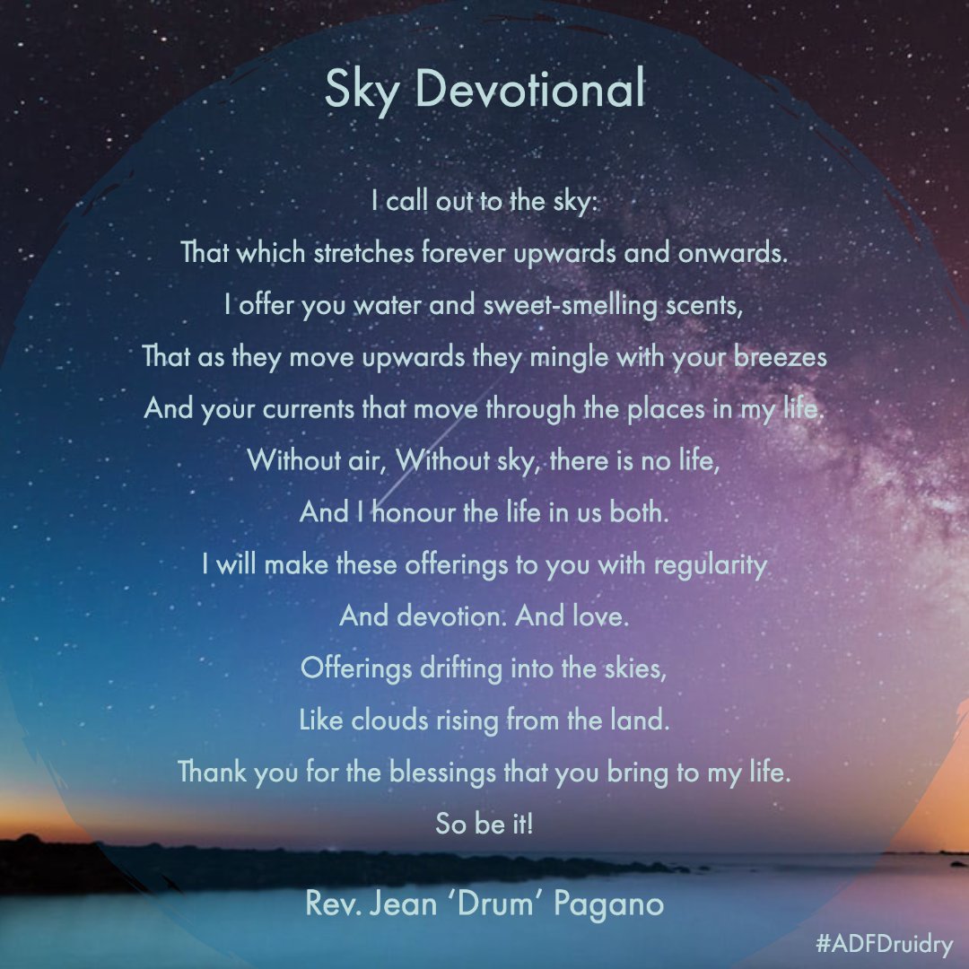 Sky Devotional I call out to the sky: That which stretches forever upwards and onwards. I offer you water and sweet-smelling scents, That as they move upwards they mingle with your breezes And your currents that move through the places in my life.pic.twitter.com/XAUa5vDba8