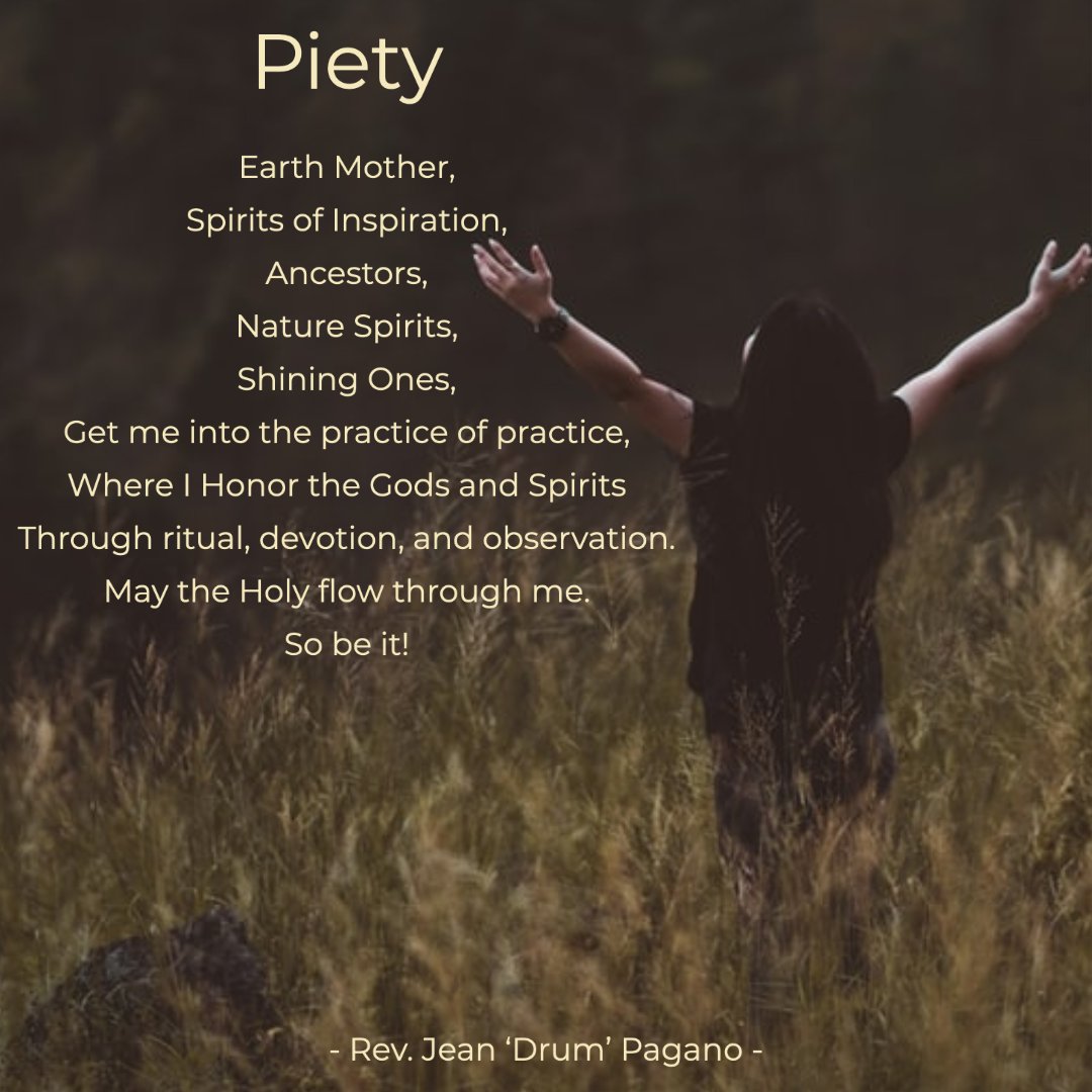 Piety Prayer Earth Mother, Spirits of Inspiration, Ancestors, Nature Spirits, Shining Ones, Get me into the practice of practice, Where I Honor the Gods and Spirits Through ritual, devotion, and observation. May the Holy flow through me. So be it! - Rev. Jean 'Drum' Pagano -pic.twitter.com/CAkiIvuoiS