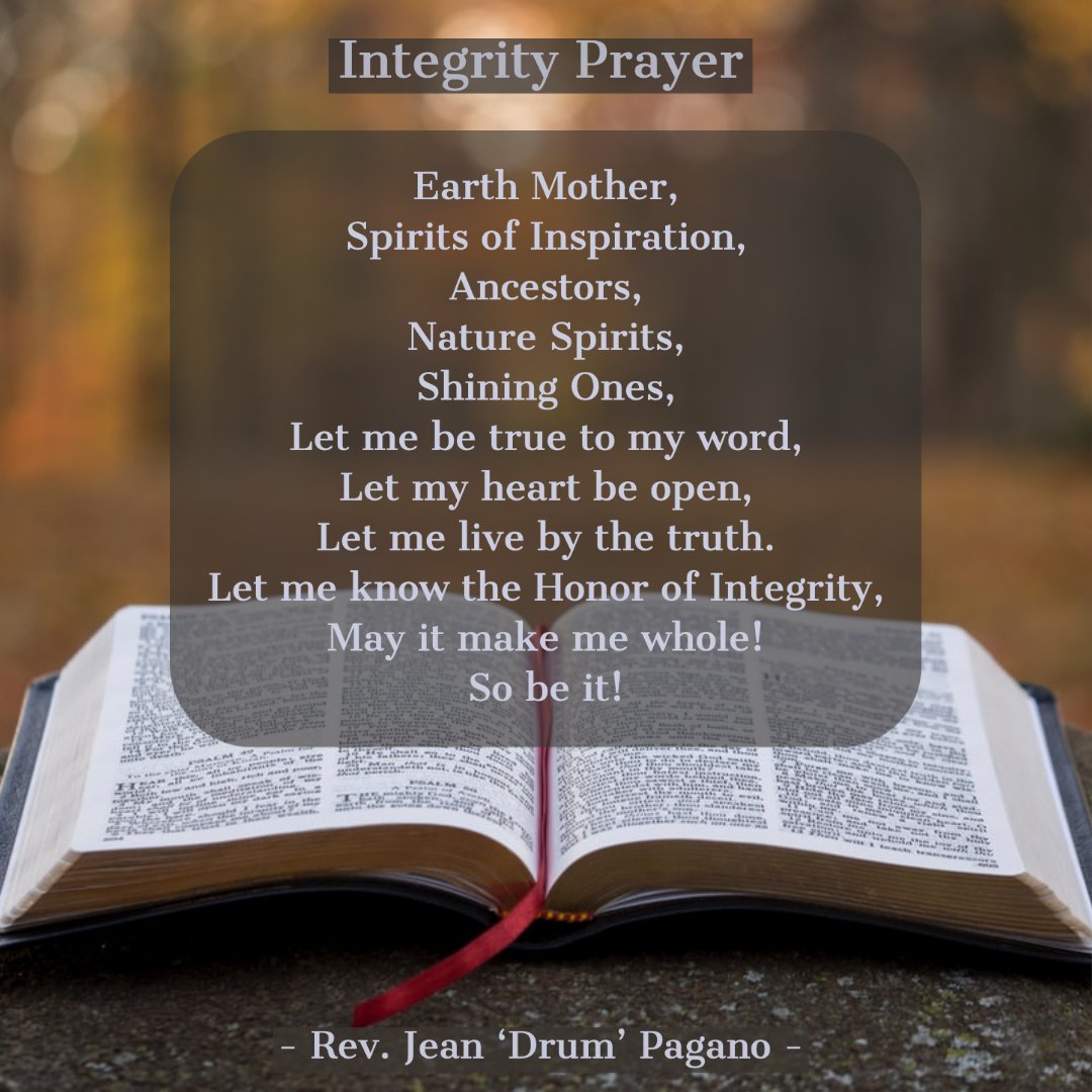 Integrity Prayer Earth Mother, Spirits of Inspiration, Ancestors, Nature Spirits, Shining Ones, Let me be true to my word, Let my heart be open, Let me live by the truth. Let me know the Honor of Integrity, May it make me whole! So be it! - Rev. Jean ' Drum' Pagano -pic.twitter.com/IiSYliLkNp