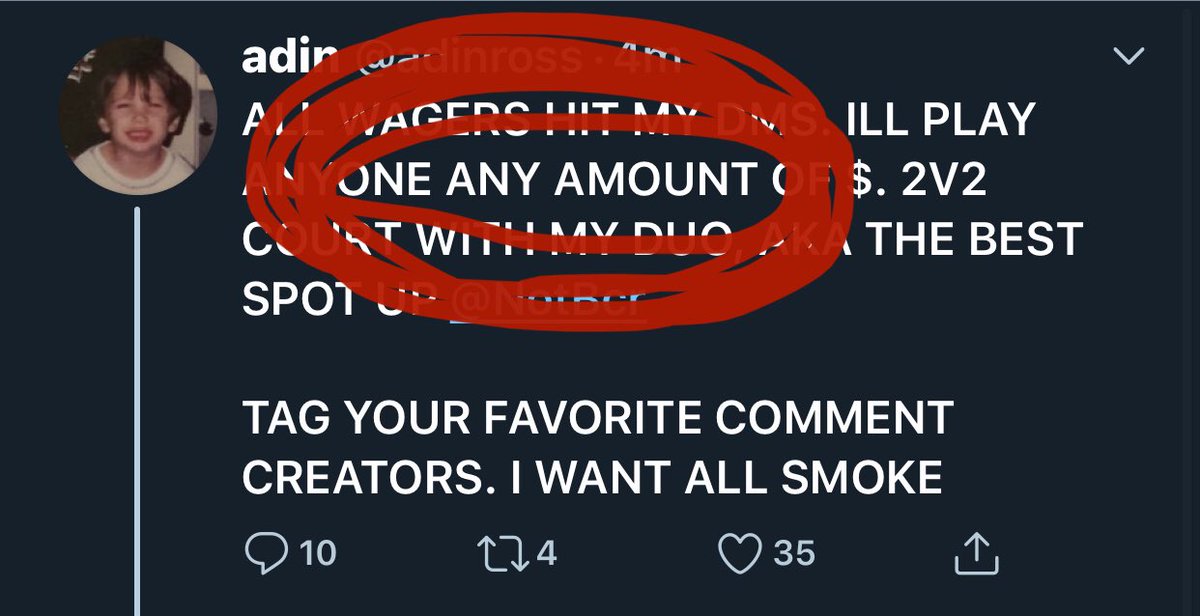 ALL WAGERS HIT MY DMS. ILL PLAY ANYONE ANY AMOUNT OF $. 2V2 COURT WITH MY DUO, AKA THE BEST SPOT UP @NotBcr