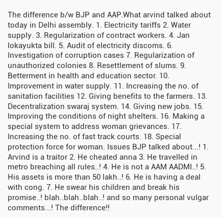 The difference b/w BJP and AAP.What arvind talked about today in Delhi assembly. 1. Electricity tari...pic.twitter.com/Nwhv38Uktl
