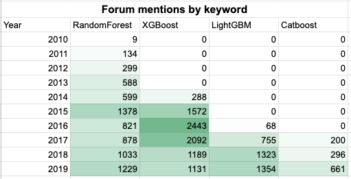 In 2011, Random Forest started being discussed in the forums. In 2014, it was XGBoost. More recently we’ve seen LightGBM and then Catboost gaining momentum. 2/3pic.twitter.com/TjtNKqaTHA
