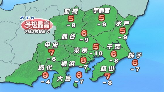 今日の関東、昼は昨日より暖かく、13~15℃前後まで上がります。ただ、午後からは北風が強まって、気温が急降下。特に夕方以降は冷えて、夜は真冬の寒さになります。防寒を。晴れますが、北関東の山沿いは雪に。pic.twitter.com/sfabw7JaUI