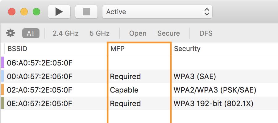 The "MFP" column indicates the Management Frame Protection mode of the BSS (if supported): "Capable" or "Required". If "Capable", the BSS allows for MFP and non-MFP stations. If "Required", the use of MFP is mandatory for all stations within the BSS. WPA3 requires the use of MFP.pic.twitter.com/c5Qa6cmTsh