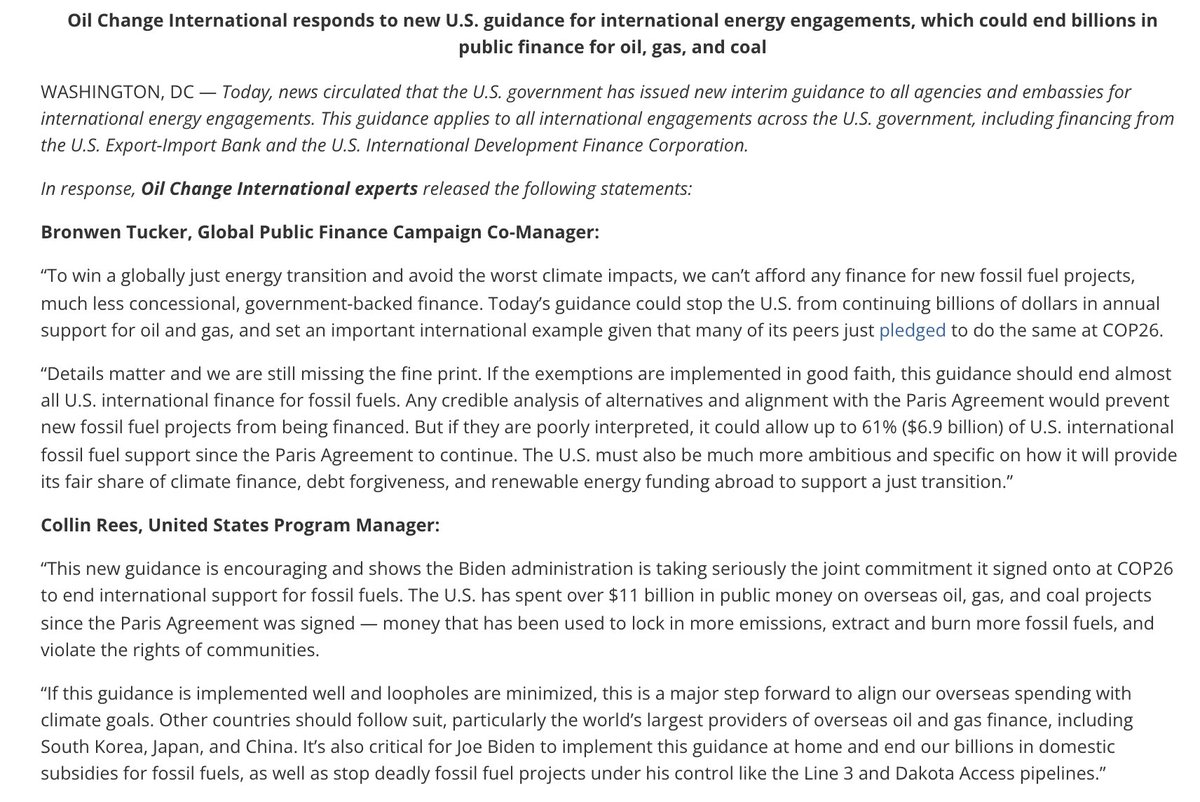 NEW: Updated guidance could end massive flows of US public money being sent to overseas oil + gas. We've sent **$11+ BILLION** to overseas fossil projects since 2016. We must fight loopholes, but this is a major step to