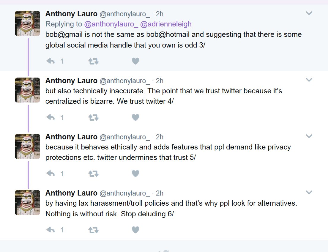 Here's the thing: Twitter is untrustworthy but THERE'S ONLY ONE OF IT. And if it changes management, WE'LL KNOW. GNUsocial instances are