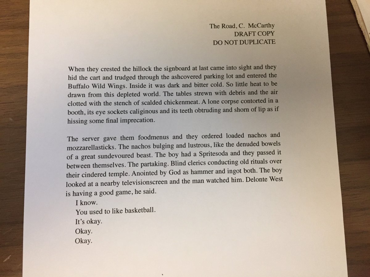 this is pretty interesting; a friend of mine works at Random House, and he just sent over the first draft of Cormac McCarthy’s The Road, which apparently included this section in which the characters go to a Buffalo Wild Wingspic.twitter.com/4DHtRtBVtf
