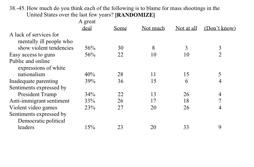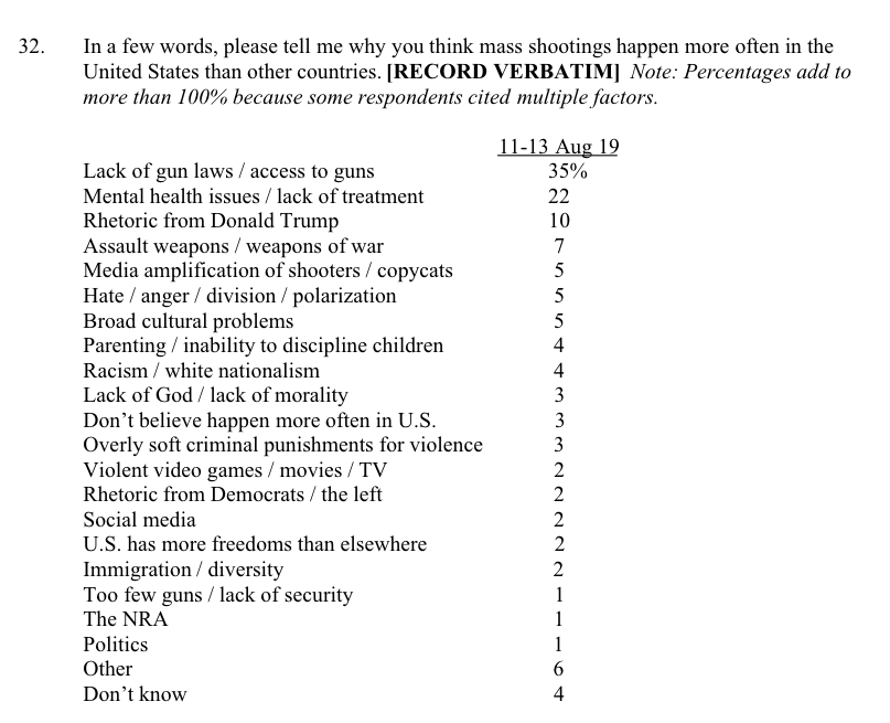 Another gun poll to add to this thread. Per NBC/WSJ (taken longer after the shootings), Americans favor: Expanded background checks 89/10 Red flag laws 76/22 Voluntary buybacks 75/23 Ban on semi-automatic firearms 62/37 They oppose ban on handguns 25/75https://www.nbcnews.com/politics/meet-the-press/support-free-trade-reaches-new-high-nbc-wsj-poll-n1043601 …