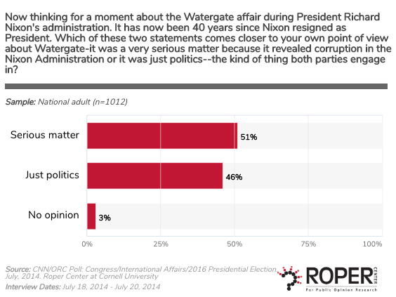 2014 poll: 51% of Americans say Watergate was a "very serious matter" 46% say it was "just politics - the kind of thing both parties engage in"pic.twitter.com/z6bXwI5rDo