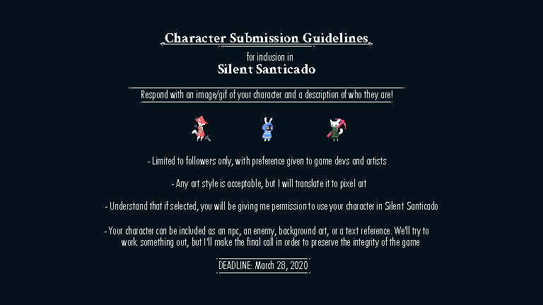 We've reached 2,000 followers!!! A simple thank you won't suffice, so I'm gonna do something a bit experimental instead: cameos! That's right - you've got a chance to get your character/enemy/item in Silent Santicado! Rules below 👇 #gamedev #indiedev #IndieWorldOrderpic.twitter.com/0vVUnP86tA