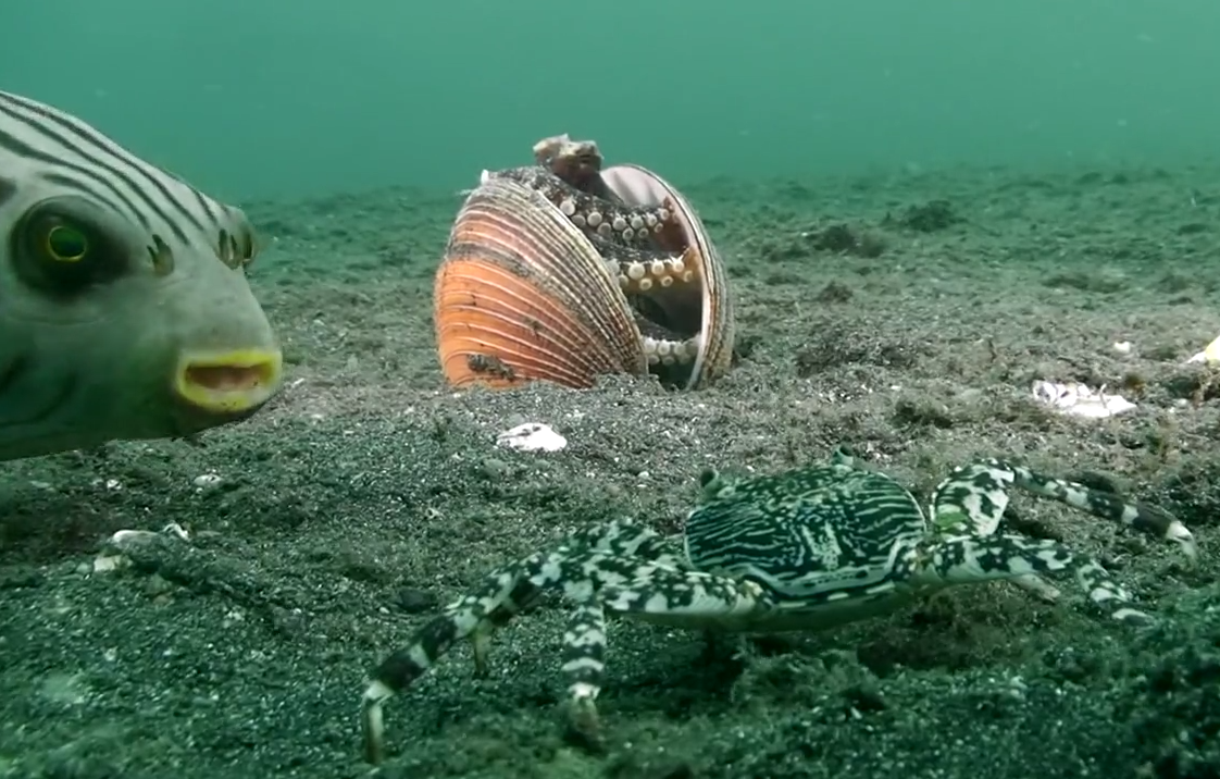 From a seashell hideout, a wily veined octopus stalks an unsuspecting rock crab. Aeon video: http://ow.ly/KyqMn pic.twitter.com/asDi3PojKd
