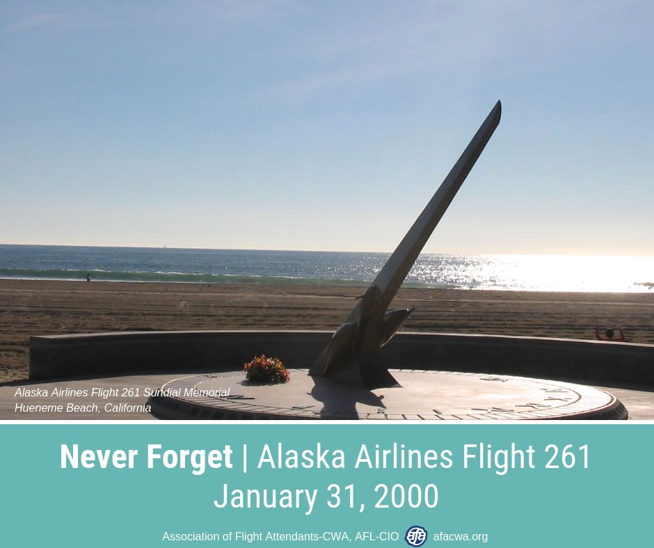 On this day in 2000, Alaska Airlines Flight 261 crashed into the Pacific Ocean about 2.7 miles north of Anacapa Island, California. We will never forget our fellow crewmembers. Our thoughts are with their friends and families today and always. https://www.facebook.com/afacwa/photos/a.398664403519/10157279609828520/?type=3&av=106977608519&eav=AfZZ4LaPB3ofvBoftP7XmhKshCc7AKlQpqWDl3zN7xAwlYpqMFV5Ak0VRqzKI15V0A8&theater …pic.twitter.com/Nkg67NhXJe