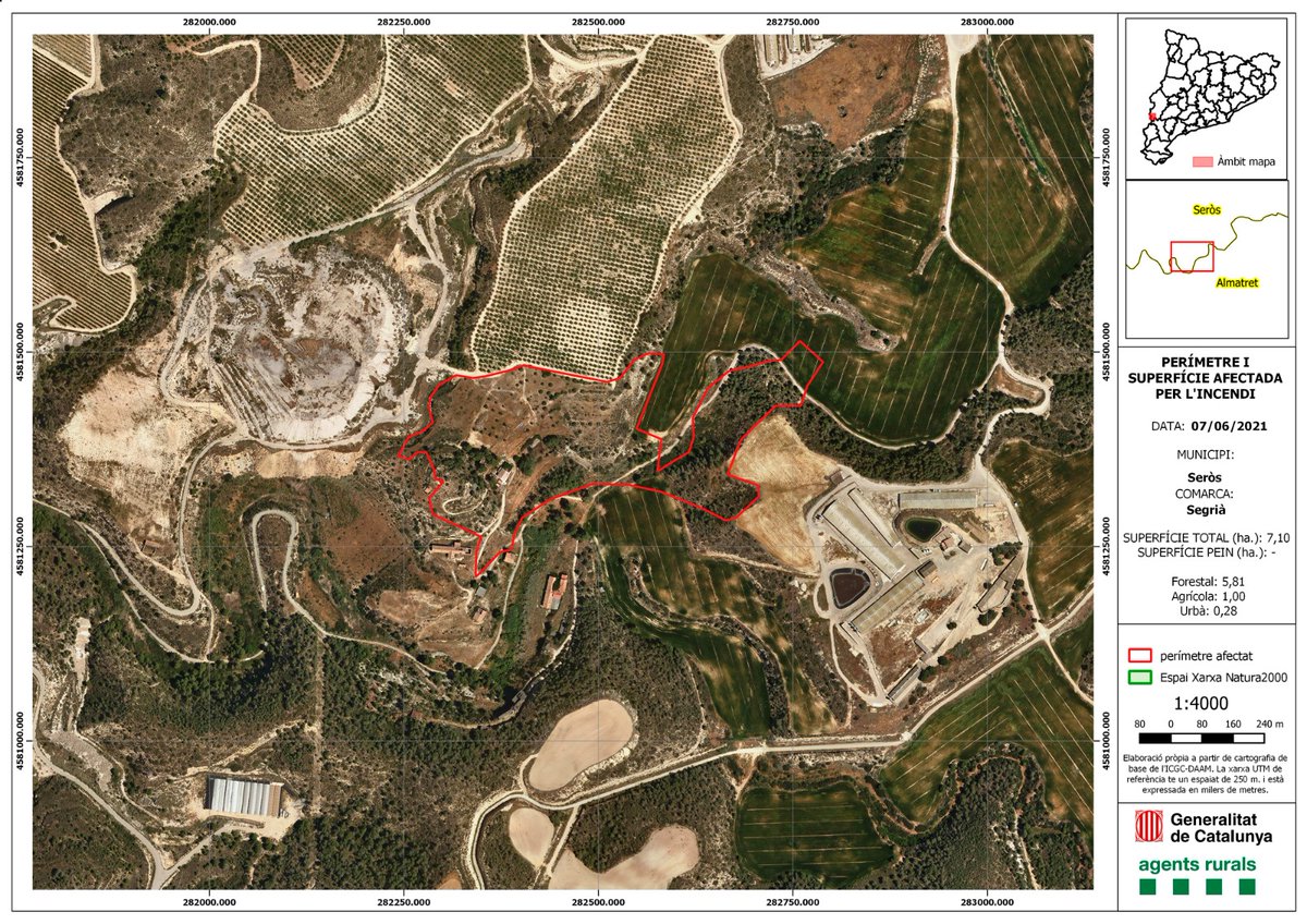L'incendi ha afectat una superfície total de 7,10 hectàrees, 1,83 ha del terme d'Almatret i 5,27 ha al terme de Seròs. 5,81 ha corresponen a terreny forestal, 1 ha a terreny agrícola i 0,28h a sòl urbà. Investiguem la causa del