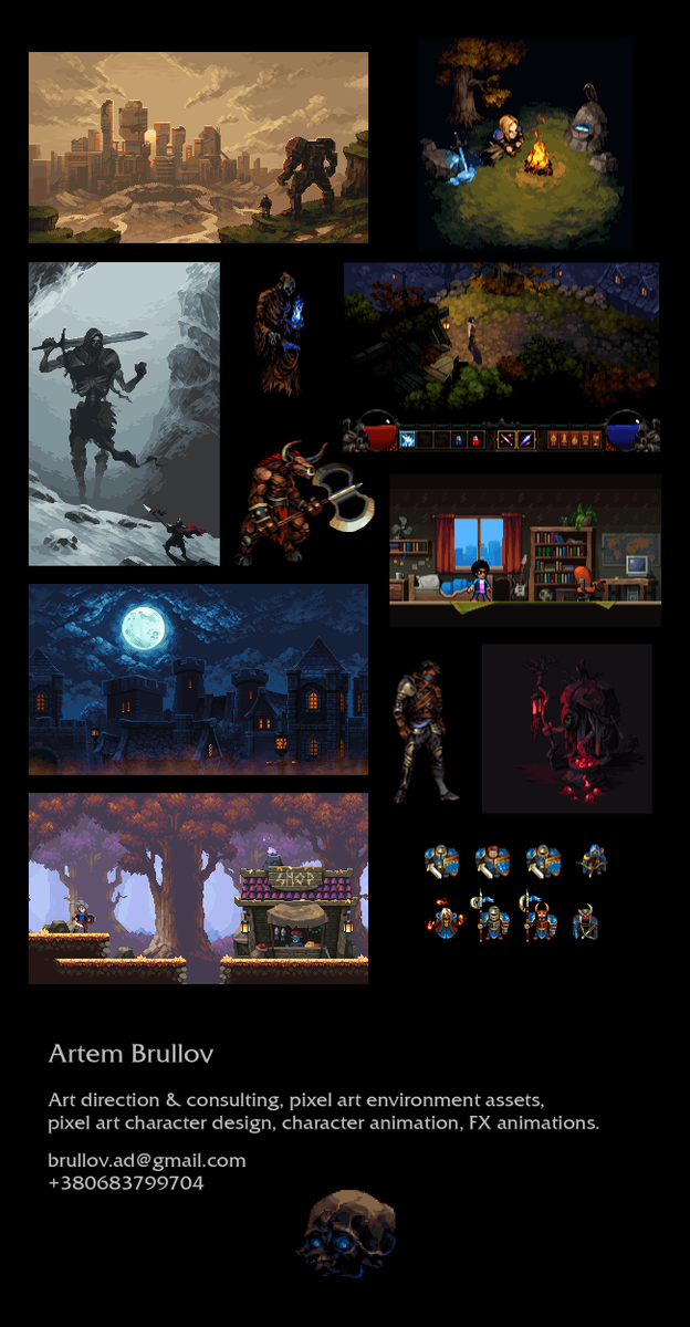 Hello Twitter! I am urgently looking for job offer. I am a pro pixel artist who can make environment assets, character design & animations, FX, icons, key arts, anything! My rate is 30 usd/hour Contact me: brullov.ad@gmail.com Or DM me Likes & RTs are very much appreciated
