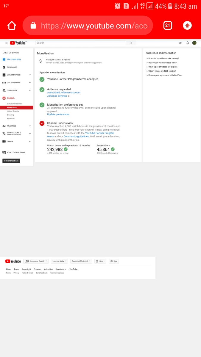 My YouTube channel complete 242k hours watch time and 45k subscribe last 1year carefully.