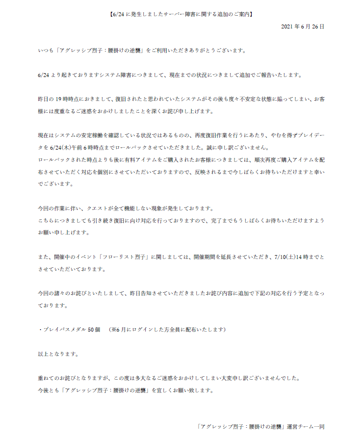 障害に関する追加のご案内 いつも「アグレッシブ烈子:腰掛けの逆襲」をご利用いただきありがとうございます。 この度の障害ではお客様には度重なるご迷惑をおかけしましたことを深くお詫び申し上げます。 詳細は添付画像をご確認いただけますと幸いでございます。 大変申し訳ございませんでした。pic.twitter.com/sv6OiVpNQp