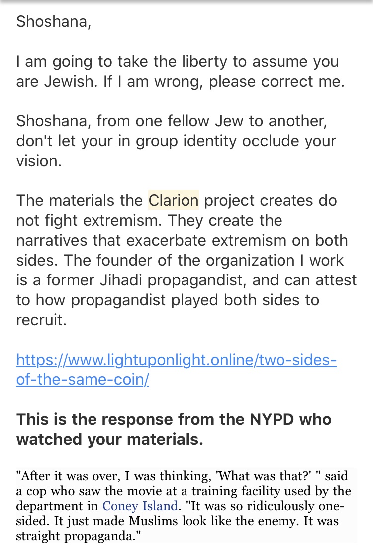 This is not the issue. As you can see I’ve openly critiqued the Clarion Project. The central issue is that people are fallible, don’t do background research and make mistakes AND are no less deserving of belonging and no less capable of doing good work.pic.twitter.com/9ldR2Y8ol5