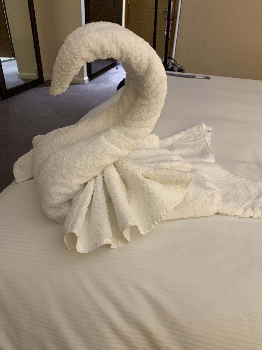 Ok my usual assessment for a fancy hotel is “has free pens” but this place also has a TOWEL SWANpic.twitter.com/q3HiU36UJv