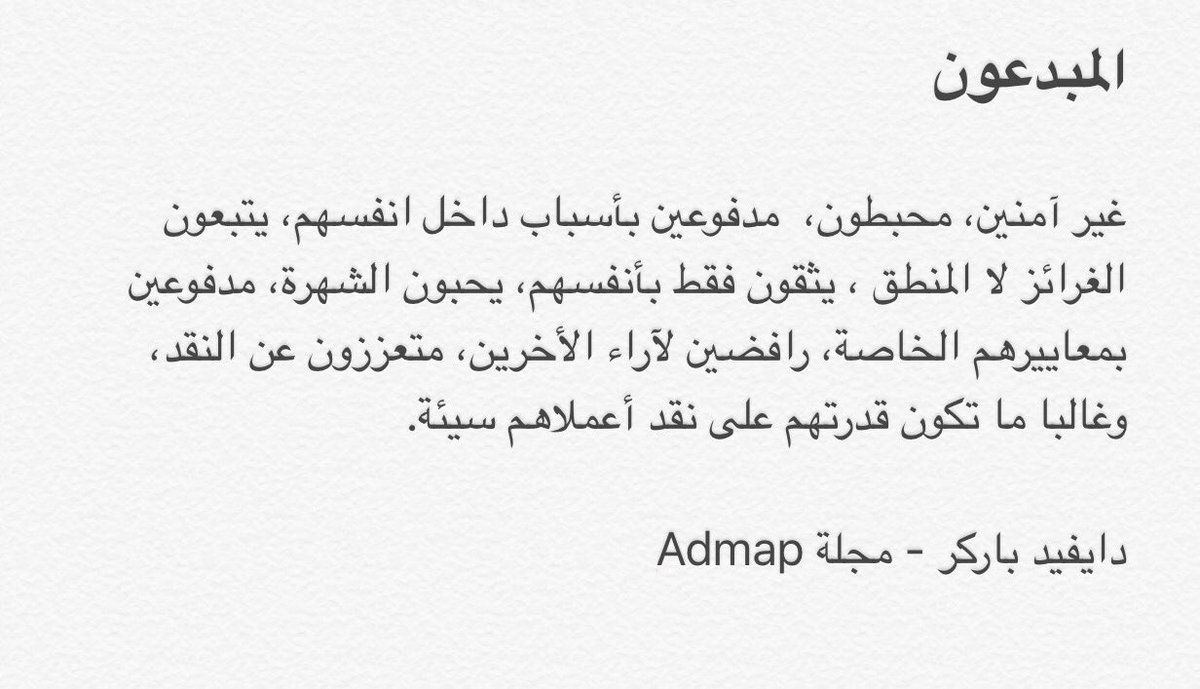 المبدعون: يثقون فقط بأنفسهم، يحبون الشهرة، مدفوعين بمعاييرهم الخاصة، رافضين لآراء الأخرين، متعززون عن النقد...pic.twitter.com/GfCQ28frm9
