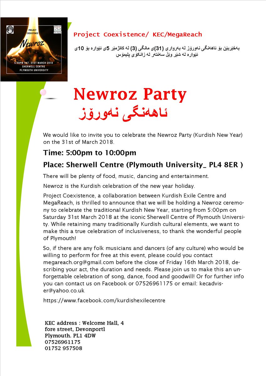 Newroz celebration (Kurdish New Year Party) March 31st from Time: From 5:00pm to 10:00 pm Place: Sherwell Centre - Plymouth