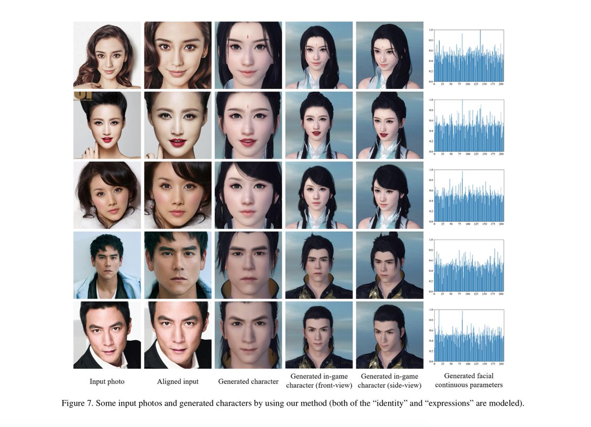 Face-to-Parameter Translation for Game Character Auto-Creation Their method allows the automatic creation of game characters based on input face photos. An “imitator” is used to model the behavior of the game engine, to make entire thing differentiable. https://arxiv.org/abs/1909.01064 pic.twitter.com/hnntYWhZx4