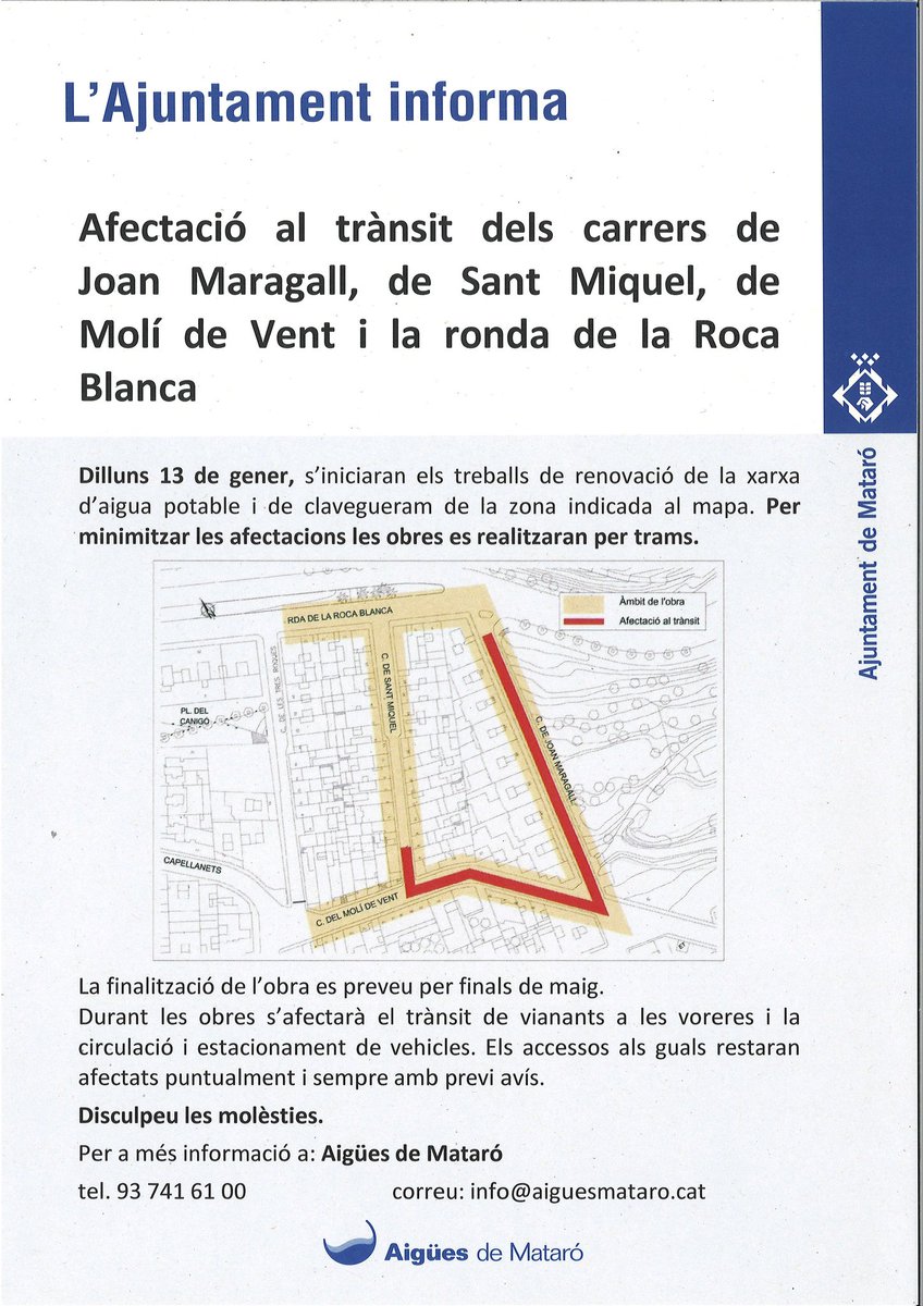 Renovació de la xarxa d’abastament i de clavegueram dels carrers de Joan Maragall, de Sant Miquel, de Molí de Vent i de la ronda de la Roca Blanca, a partir d’avui dilluns 13 de gener.