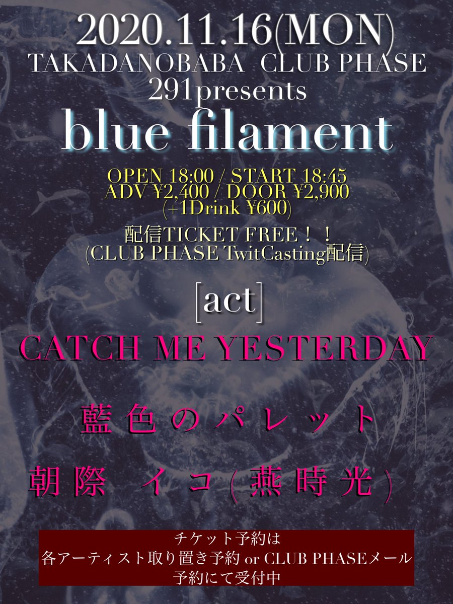 急遽ですが来週月曜日高田馬場pheaseでのライブが決まりました。 ご都合宜しければ是非。 2020.11.16(月) 高田馬場CLUB PHASE 『blue filament』 OPEN : TBA / START : TBA ADV¥2,400 / DOOR ¥2,900 +1Drink ¥600 [act] CATCH ME YESTERDAY / 藍色のパレット /.朝際イコ(燕時光) / ..and more