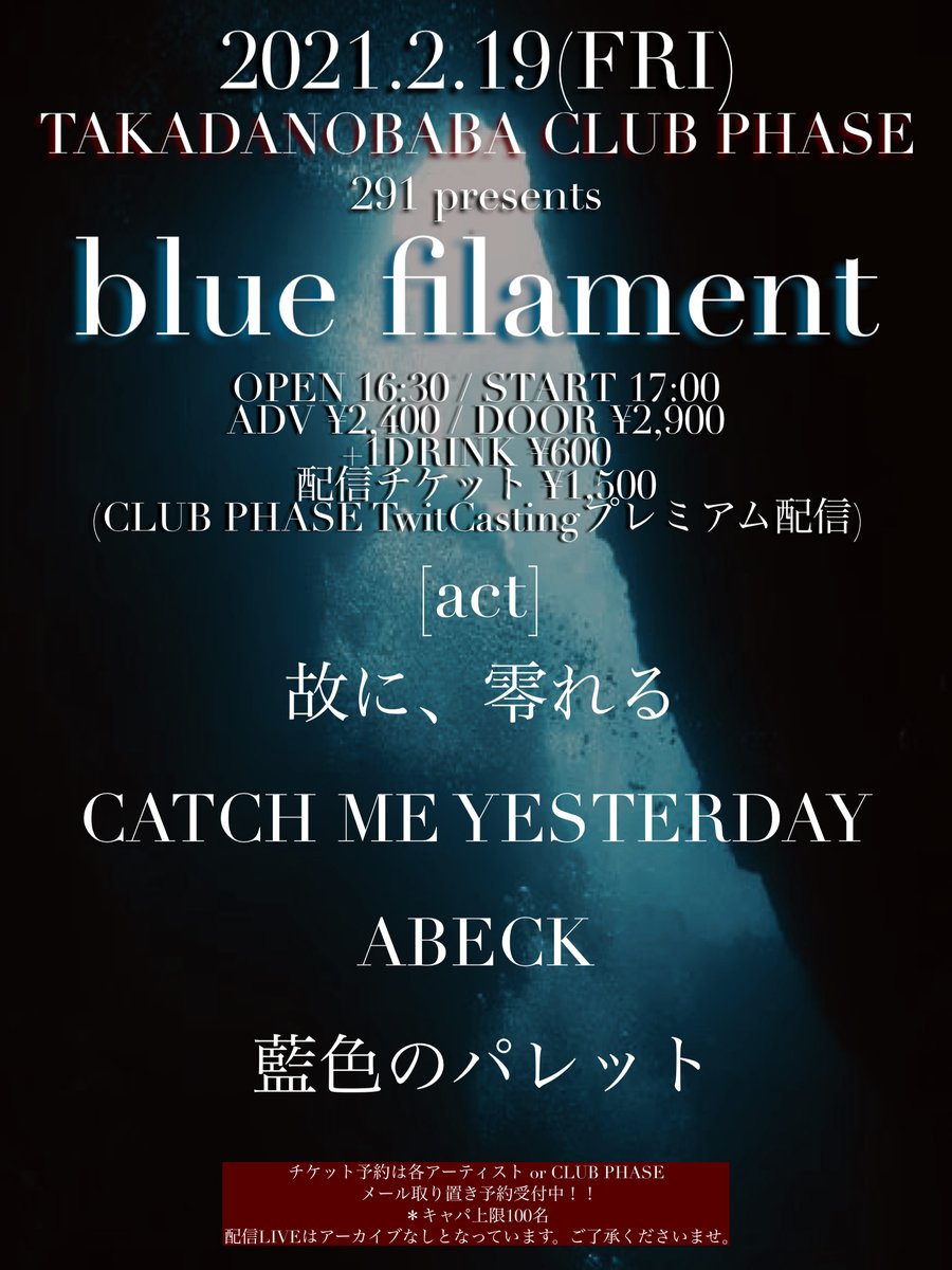 急遽ですが2月1本ライブ決まりました 高田馬場 クラブ フェイズ 2021.2.19.(金) 『blue filament』 OPEN TBA / START TBA ADV ¥2,400 / DOOR ¥2,900 +1Drink¥600- 配信TICKET ¥1,500 https://twitcasting.tv/clubphase/shopcart/52151 …… [act] 故に、零れる / ABECK / CATCH ME YESTERDAY / 藍色のパレット/ ...and more