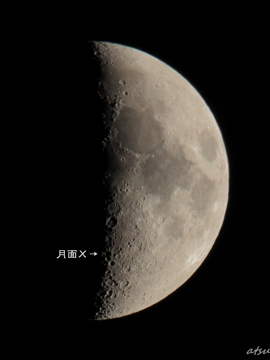 【月面X】 1日夜に見られた月面X。 20時20分ごろの撮影です。 高倍率コンデジで撮ってがっつりトリミングしました。