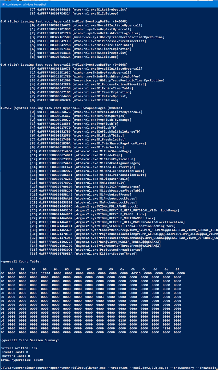 Sat down and learned some more ETW for the upcoming Windows Internals 7th Edition, Part 2 book, and ended up creating an ETW Based Hyper-V Hypervisor Call Tracer using new functionality in 20H1, including stack tracing and symbol resolution. No TDH, xperf or complexity.pic.twitter.com/DzqzymJkBy