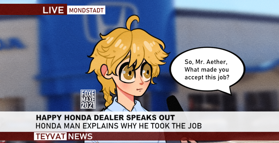 @airzach 's livestream whilst I was on my lunch break and if I can remember correctly he said he did some commercials with Honda and I just imagined Aether as a Honda dealer.#GenshinImpact#genshinimpactfanart#genshinimpactcomic#genshinpic.twitter.com/oiT0s5CT8z