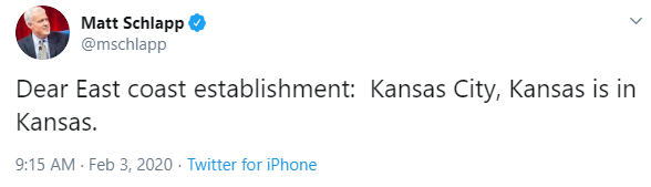 Everybody in America: Thanks, Mattie. The explicit reference to the state in the place name can be very helpful. For example, Kansas City, Missouri, where the Chiefs play, is in Missouri. But please keep throwing out geography tips; it's more helpful than your usual propaganda.pic.twitter.com/rfSzbtDDRO
