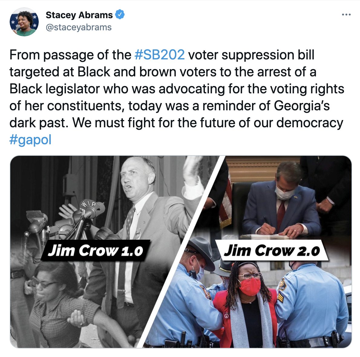 Lawmakers/activists are outraged after a Georgia rep. was arrested for protesting new voter laws. The laws restrict access to absentee ballots and let GOP lawmakers replace local election officials — a move critics say are designed to target majority POC and Democrat counties.pic.twitter.com/8bnFvyyrYF