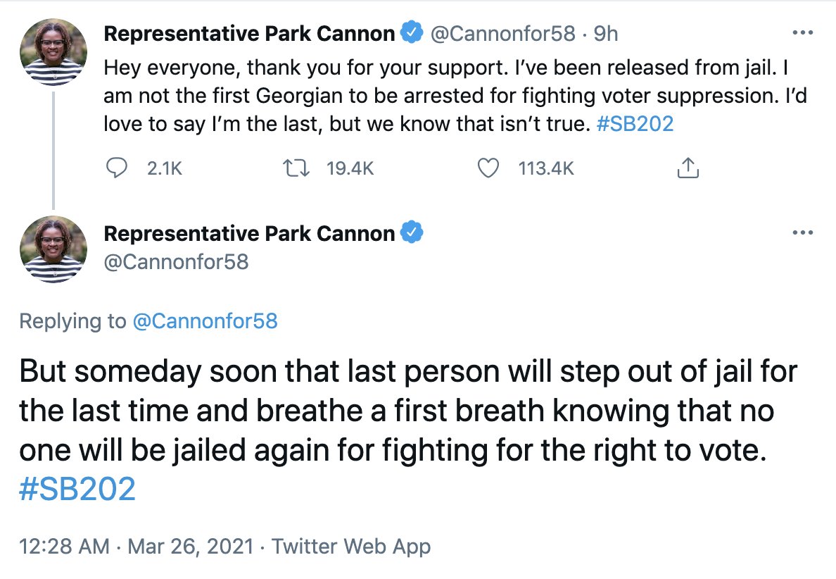 A Black state lawmaker in Georgia was arrested for protesting "Jim Crow-era" voter laws critics say are designed to disenfranchise voters of color. GA Rep. Park Cannon was charged with a felony for knocking on the governor's door — facing 1-5 yrs in prison. (📷: @TWareStevens)pic.twitter.com/sH1FuIg0Lk