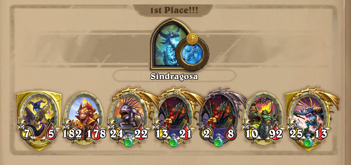 Because I had so many golds and was able to gold up that bad boy his trait allows him +2 +2 not upgraded and +4 +4 upgraded for each upgraded minion I have on the field.