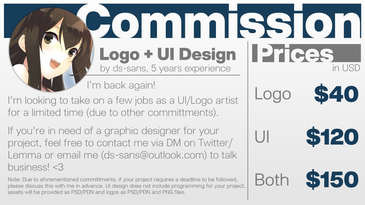 I'm opening my logo/UI commissions again, for a short time only! If you're looking for an artist, please contact me. RTs are appreciated!