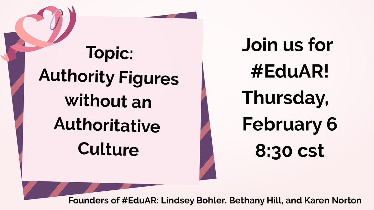 #EduAR this Thursday as we discuss being authority figure without having an authoritative classroom and school culture. Do we strive for compliance, or do we want more? Can’t wait to learn from everyone!#JoyfulLeaders#leadlap#cultureed#leadupchat@Lindsey_Bohlerpic.twitter.com/MOZ37AW7XS