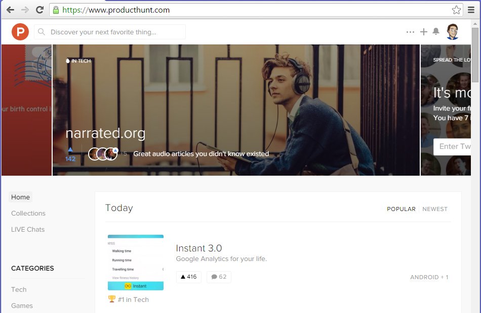 @alangarrec 100 product hunters upvoted http://narrated.org . Radical.