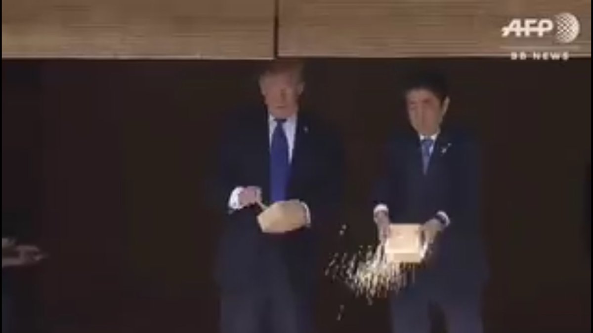 President Trump empties his fish food container while feeding koi AFTER THE Prime Minister Abe EMPTIED HIS at Akasaka Palace. -FIXED-pic.twitter.com/ZDItO0kRsV