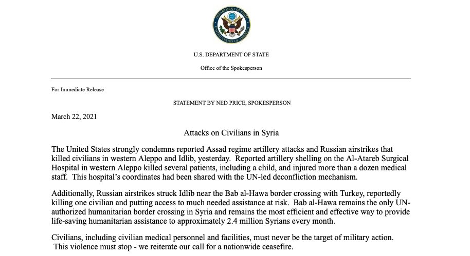 US "strongly condemns reported Assad regime artillery attacks and Russian airstrikes that killed civilians in western Aleppo and Idlib, yesterday," says