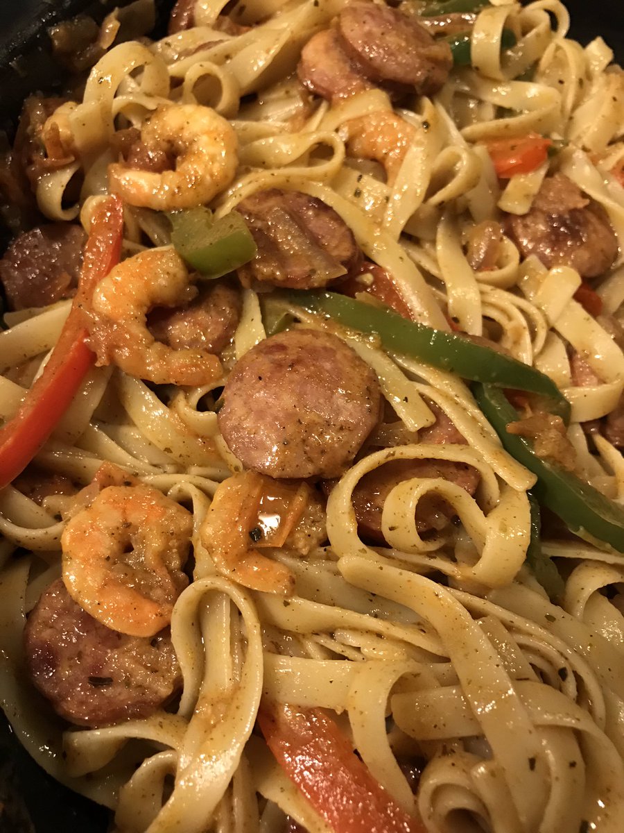 I browned sausages, threw in shrimp, then removed from pan. Added red/green peppers and red onions, cooked for a few mins then added tomatoes, butter and some chicken stock. Seasoned with more Cajun, salt, pepper and oregano. Add cook pasta and BAM!pic.twitter.com/nV0sJFcbLu
