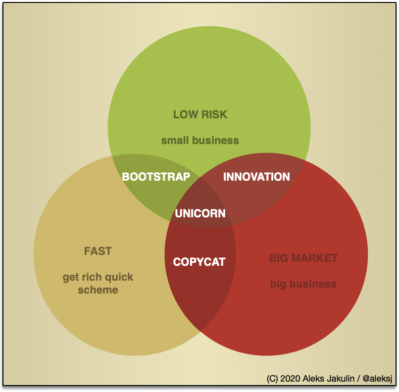 Startups: big market, low risk, high speed - pick two of the three. (This came out of a conversation with