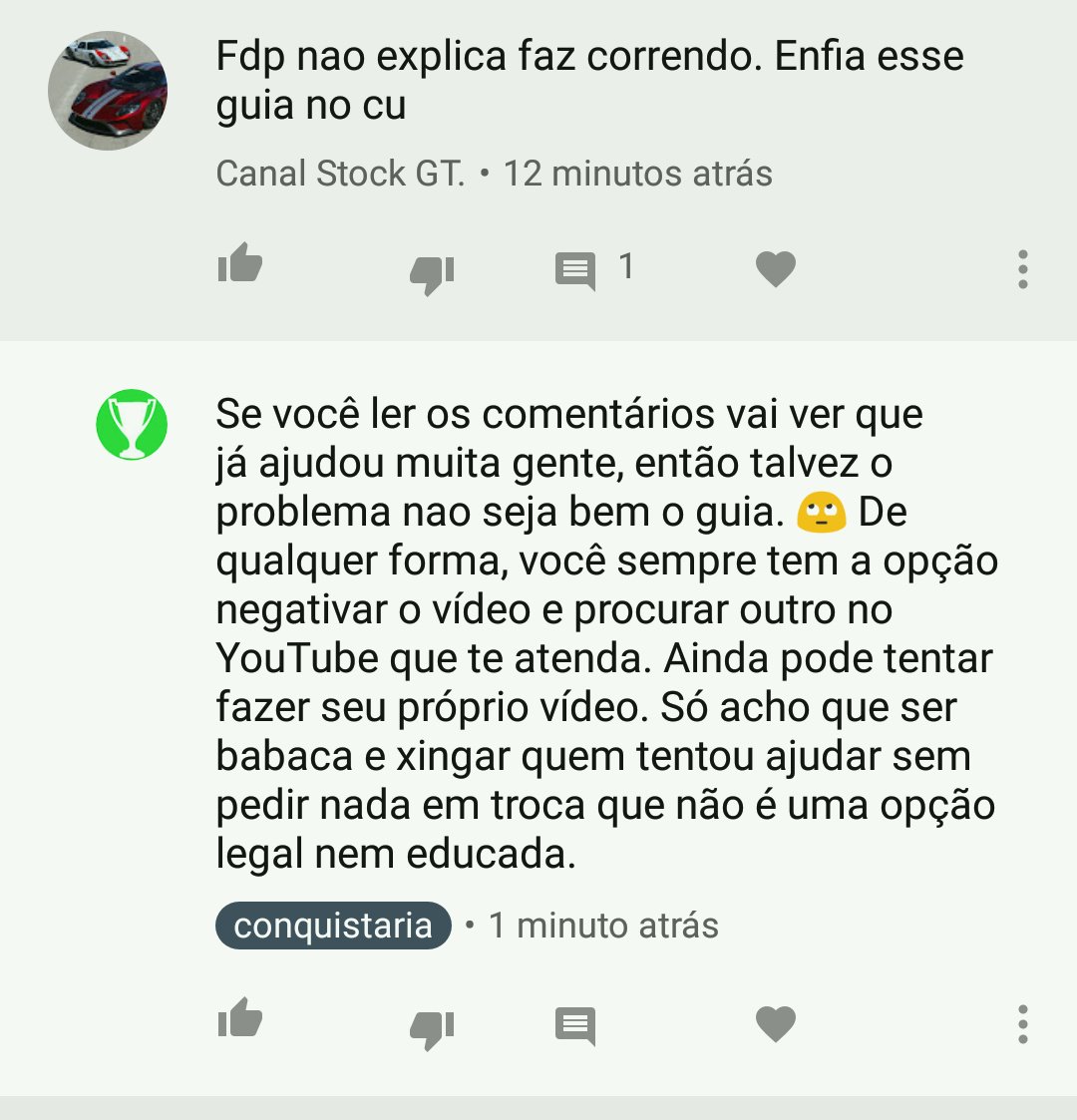 Além de pegar um guia mastigadinho e de graça, o cara prefere ofender pqp, por isso eu digo, o @TeamYouTube @YouTubeBrasil deveria ter o recurso de banimento na página de comentários fixos de vídeos pra evitar esse tipo de pessoa